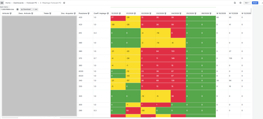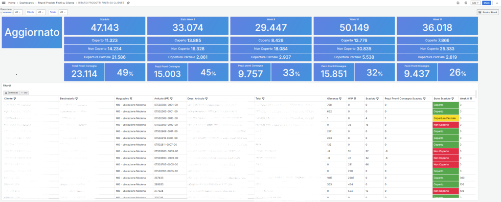 • Visione d’insieme e controllo: la gestione di numerosi codici prodotto rendeva difficile avere un quadro chiaro. Le dashboard personalizzate hanno risolto questo problema, permettendo di trasformare i dati in decisioni rapide e migliorare il rispetto dei tempi di consegna.